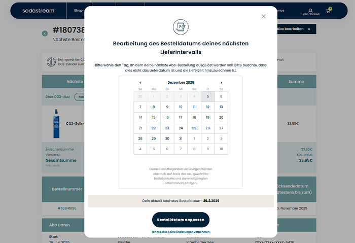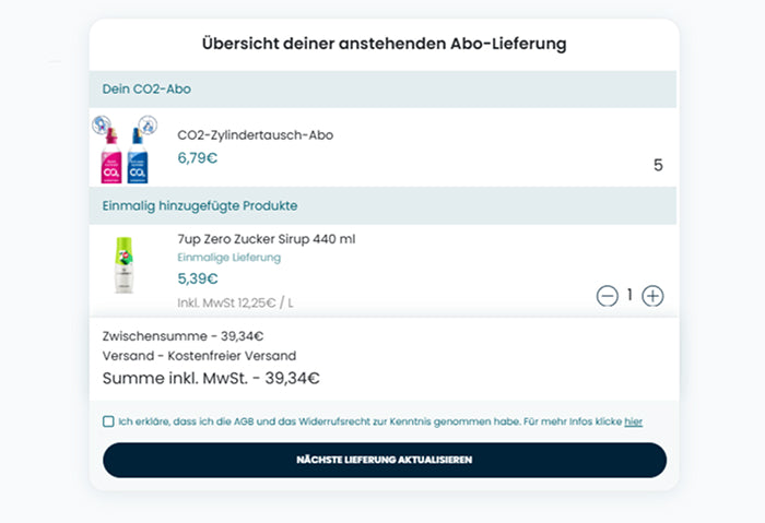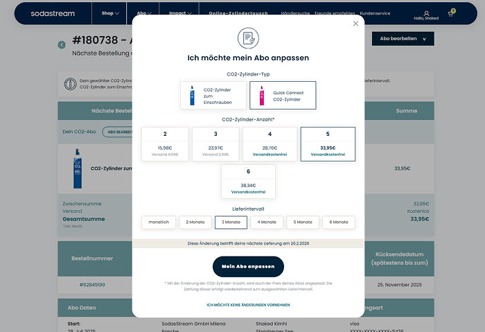 Ändere den CO2-Zylinder-Typ, die Menge oder das Lieferintervall (Bestellhäufigkeit) mit einem Klick in deinem Konto.