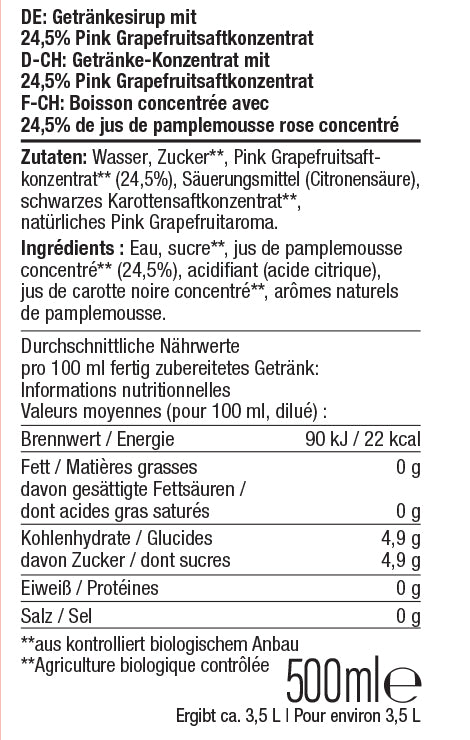 Inhalt: 500 ml BIO Sirup, ausreichend für ca. 3,5 Liter Fertiggetränk.